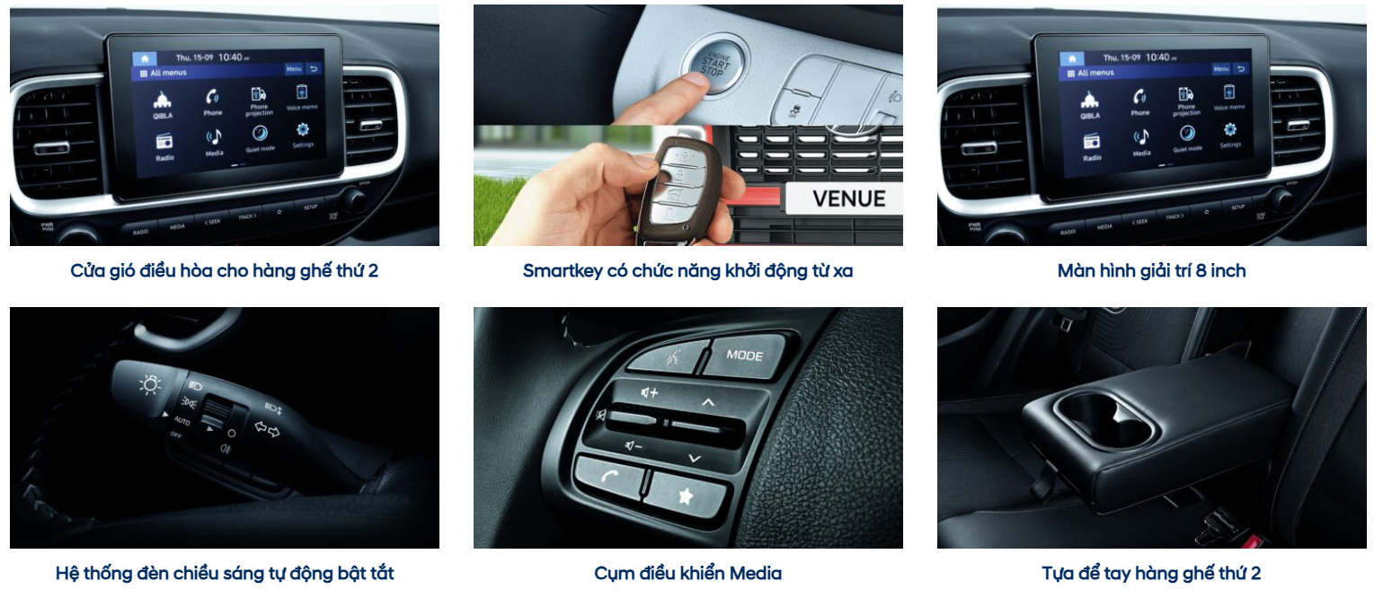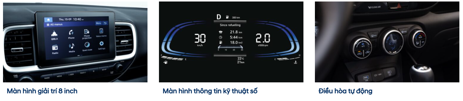 Hyundai Venue mang đến các tính năng hiện đại hàng đầu phân khúc như cửa gió cho hàng ghế sau, cửa sổ trời chỉnh điện, đèn chiếu sáng tự động bật tắt, màn hình giải trí 8 inch, màn hình thông tin kỹ thuật số.