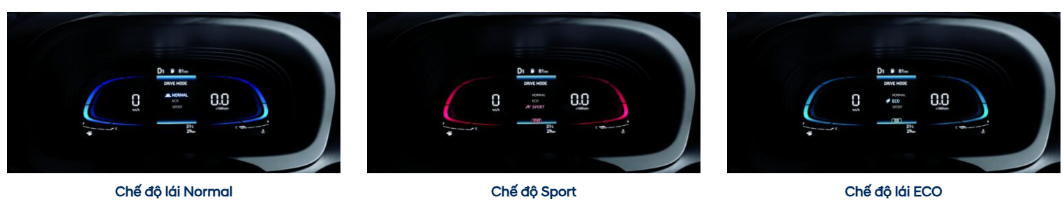 Hyundai Venue được trang bị Drive Mode 3 chế độ lái Normal – Eco – Sport, hệ thống sẽ trực tiếp can thiệp vào các hệ thống truyền động của xe: vô lăng, hộp số, chân ga,… nhằm tạo ra sự khác biệt về cảm giác lái cũng như khả năng hoạt động của xe.